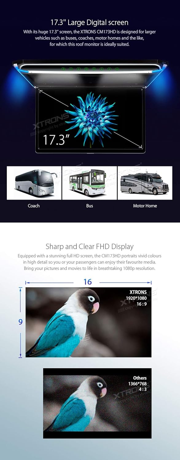 Xtrons 17 3 Inch 16 9 Ultra Thin Fhd Digital Tft Screen 1080p Video Car Overhead Player Roof Mounted Monitor Hdmi Port 19201080 Full High Definition Cm173hd Amazon Com Au Electronics